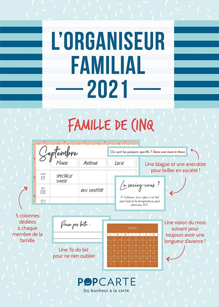Un design unique et original créé par une équipe de graphistes passionnés, avec des jolis motifs différents tous les mois, des blagues et des infos insolites, 1 colonne par personne (jusqu’à 5 personnes) et des grandes cases pour noter les activités de chacun. Une to-do list intégrée et la vision du mois suivant pour une organisation sans prise de tête.